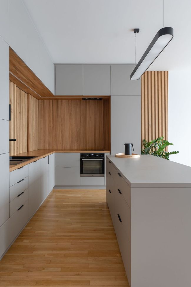 Kuchyňkou linku v šedé barvě doplňují dřevěné lamely, které místu dodávají noblesu.