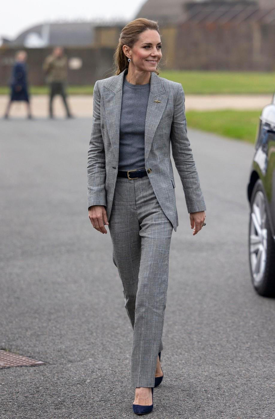 Při návštěvě RAF Coningsby princezna oblékla sofistikovaný šedý kostým – sako a kalhoty v decentním vzoru Prince of Wales. Pod sako zvolila jemný světle šedý svetr značky Alexander McQueen. Kostým přepásala tenkým černým páskem s výraznou zlatou sponou. Na nohou měla tmavomodré semišové lodičky, které ladily s celkovým tónem outfitu.