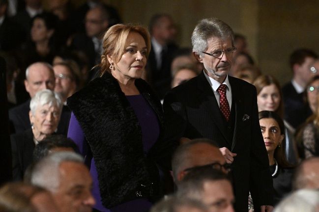 Bývalá první dáma Dagmar Havlová se ukázala v působivé kombinaci fialových pouzdrových šatů od Beáty Rajské, šperků od Bvlgari a černé kožešinové šály.