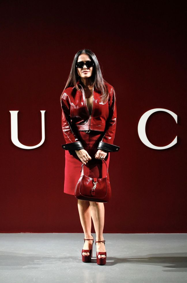V Miláně zase upoutal pozornost červený kostýmek v podání hollywoodské hvězdy s mexickými kořeny Salmy Hayekové.