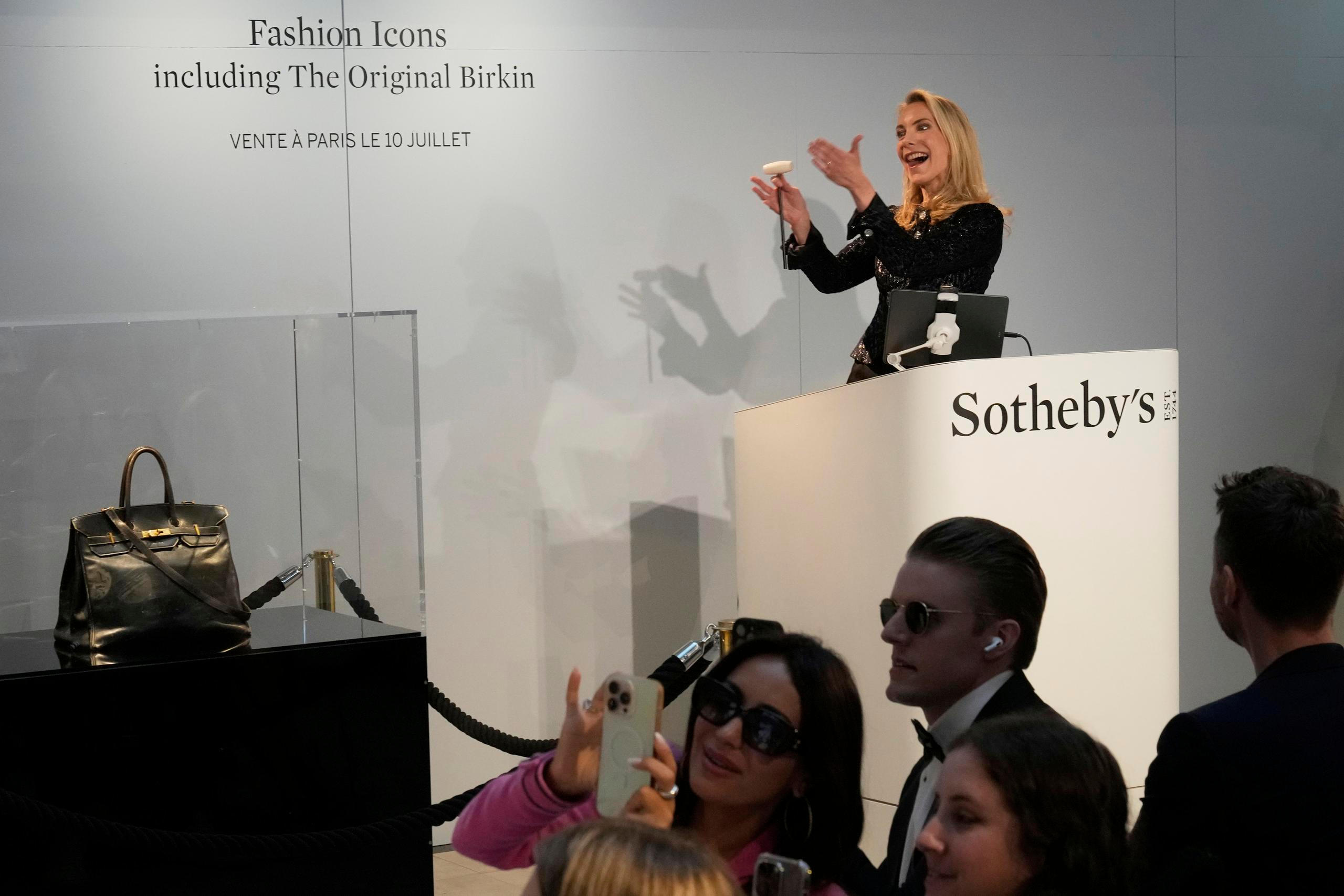 Dražební úřednice Aurélie Vandevoorde gestikuluje poté, co byla původní kabelka Birkin, kterou značka Hermès vytvořila pro Jane Birkin, vydražena za 8,582 milionu eur, ve čtvrtek 10. července 2025 v Paříži.