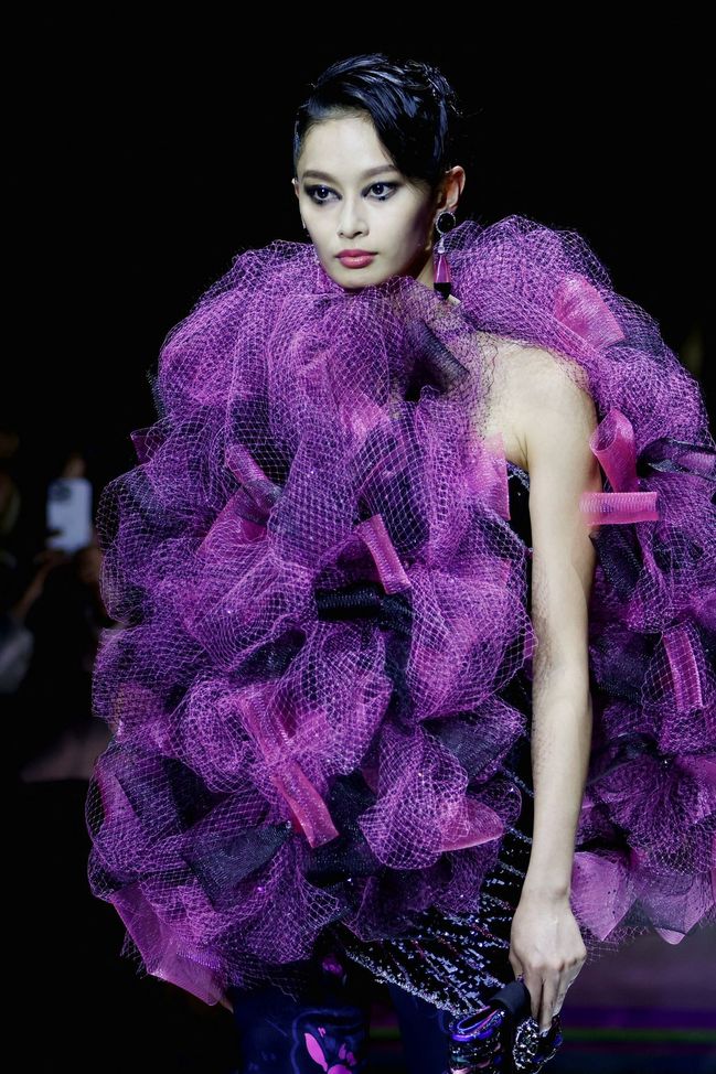 Kreace návrháře Giorgia Armaniho v rámci přehlídky kolekce Haute Couture podzim/zima 2022-2023 módního domu Giorgio Armani Prive v Paříži..