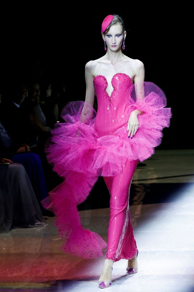 Kreace návrháře Giorgia Armaniho v rámci přehlídky kolekce Haute Couture podzim/zima 2022-2023 módního domu Giorgio Armani Prive v Paříži.