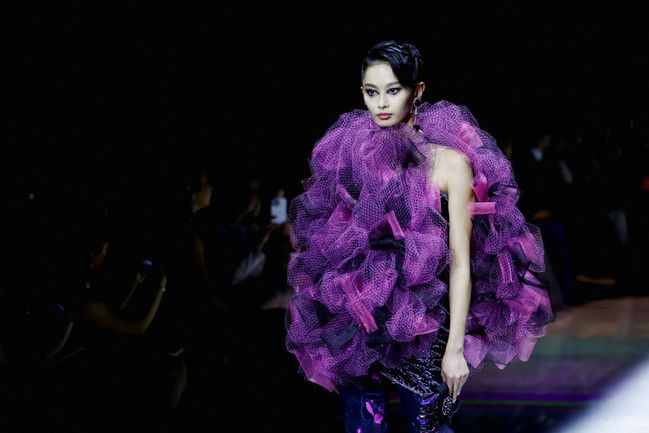 Kreace návrháře Giorgia Armaniho v rámci přehlídky kolekce Haute Couture podzim/zima 2022-2023 módního domu Giorgio Armani Prive v Paříži.