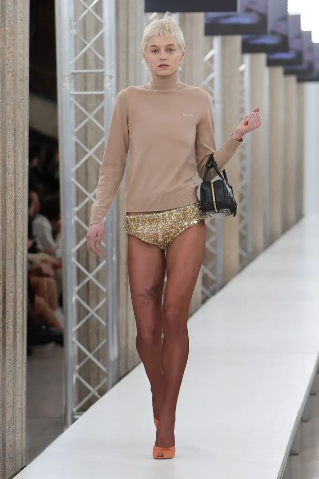Ve třpytivých rádoby kalhotkách Miu Miu se předvedla herečka Emma Corrinová, která si vydobyla uznání coby mladičká princezna Diana ze seriálu Koruna, mapující osudy britské královské rodiny.