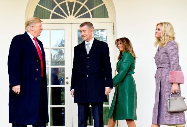 Melanie Trumpová zvolila lahvově zelený kabát z jemné kůže značky Alexy Chung, který krásně zdůrazňuje pas a je zajímavý i elegantní zároveň. Tvoří zajímavý kontrast s červenou kravatou Donalda Trumpa.