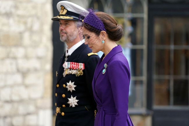 Na korunovaci krále Karla III. se dostavila ve fialovém kompletu s odpovídajícím fialovým fascinátorem, tentokrát evokujícím čelenku. Tyrkysové doplňky outfit zpestřily a neubraly mu na eleganci.