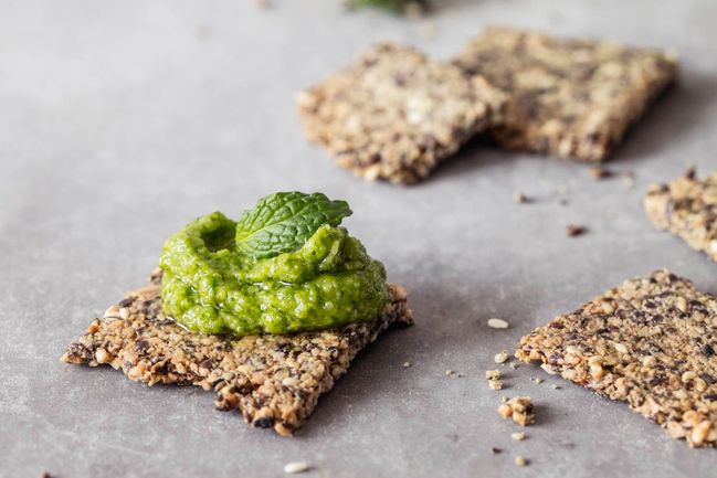 Podávejte s dipem (všechny ingredience kromě máty jednoduše společně rozmixujte) nebo jinou pomazánkou.