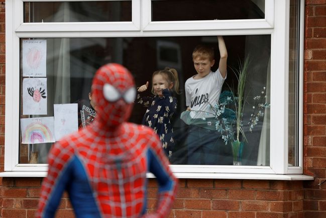 Spider-Man dělá radost dětem, ty superhrdinu pozorují kvůli karanténě přes okno