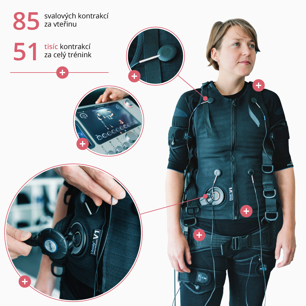 Do speciální vesty pro EMS trénink se zapojí deset dvojic elektrod, kdy je každá dvojice umístěna na pravé a levé polovině těla, a tlustý kabel, spojující korzet se zařízením, prostřednictvím něhož vám bude trenér modulovat sílu elektrického proudu. Na něm je zároveň umístěn monitor, který vám při cvičení pomáhá – vidíte na něm vizualizaci konkrétních cviků a čas, kdy je třeba zapnout svaly a kdy je čas na odpočinek.