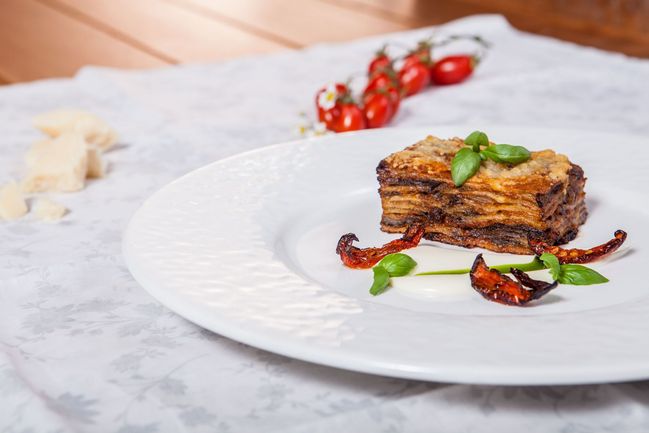 Vychlazené lilky pokládejte do vrstev spolu s tomatovou omáčkou, bazalkou a strouhaným Paramigianoreggiano.