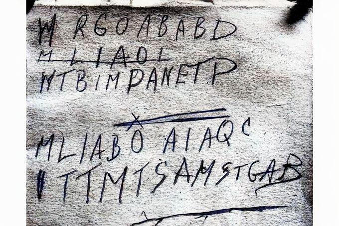 Fotografie nerozluštěné šifry nalezené r. 1949 v knize Rubáiját, klíčového důkazu v záhadném případu Somertonského muže v Austrálii. Kolorováno