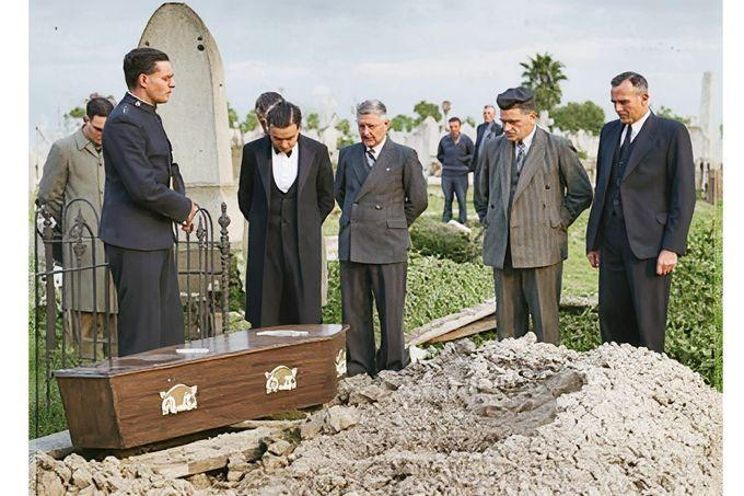 Pohřeb neznámého muže ze Somertonu na hřbitově West Terrace v Adelaide dne 14. června 1949. Službu vedl důstojník Armády spásy. Kolorováno