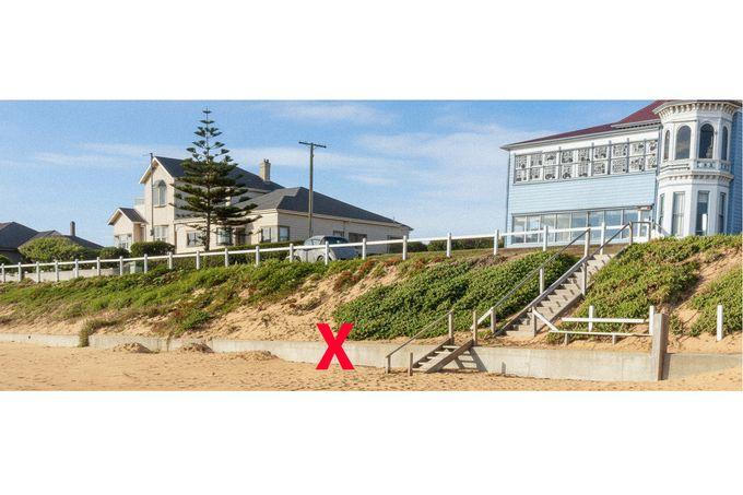 Křížek označuje místo na pláži Somerton v Adelaide, kde bylo 1. prosince 1948 nalezeno tělo neznámého muže, známého jako Somertonský muž. Kolorováno
